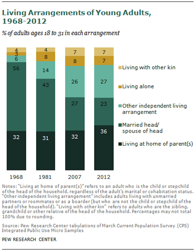 Pew polls since 1968 showed the number of young adults living at home has consistently been about 32%, but in 2012, that number increased.