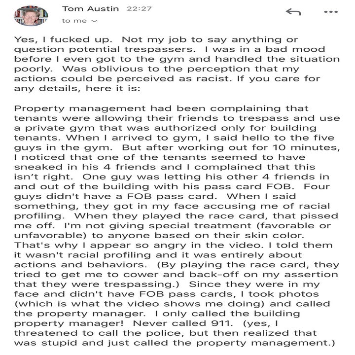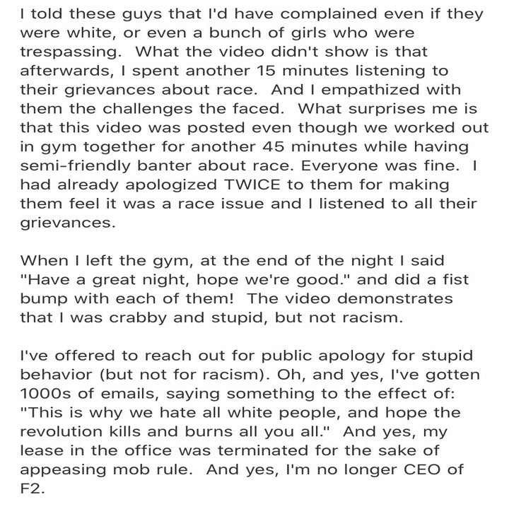 "Yes, I fucked up. Not my job to say anything or question potential trespassers," he wrote. "I was in a bad mood before I even got to the gym and handled the situation poorly. Was oblivious to the perception that my actions could be perceived as racist."