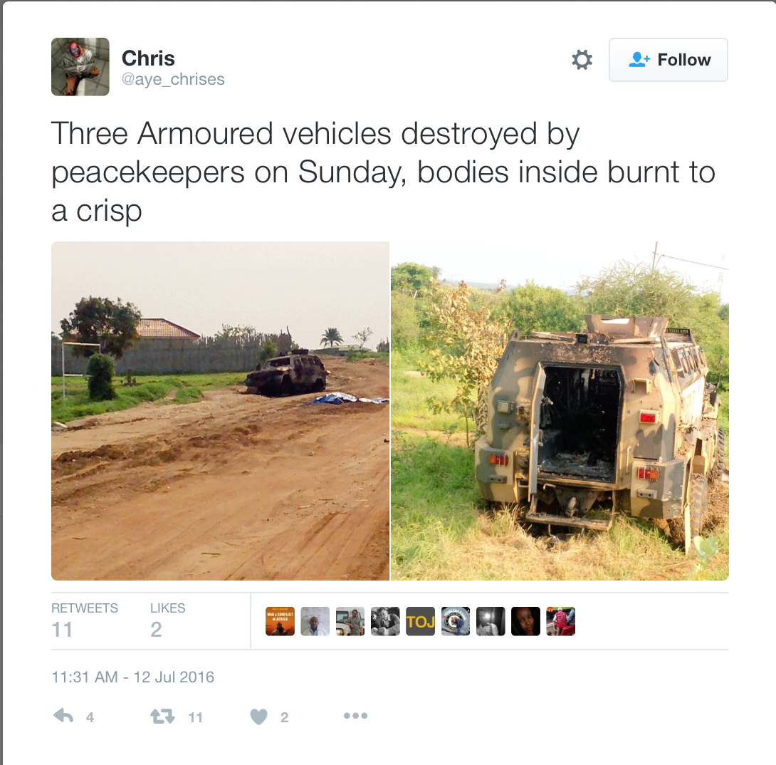 In a series of tweets and a blog post, Atem claimed the UN had killed South Sudanese troops by firing on armored vehicles and burning them alive inside.