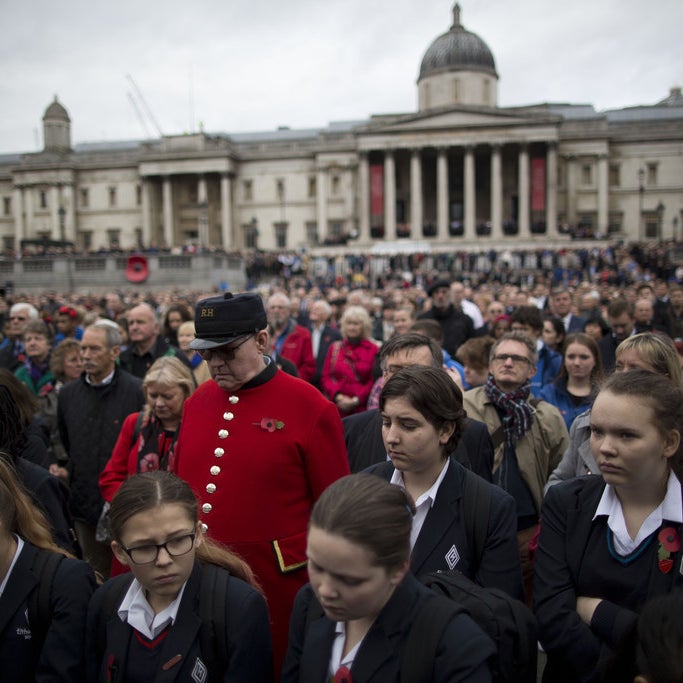 Left, Polish Army veterans salute in Warsaw. Center, A two-minute silence to mark Armistice Day, in Trafalgar Square, London. Right, French President Francois Hollande reviews Republican Guards at the Arc de Triomphe.