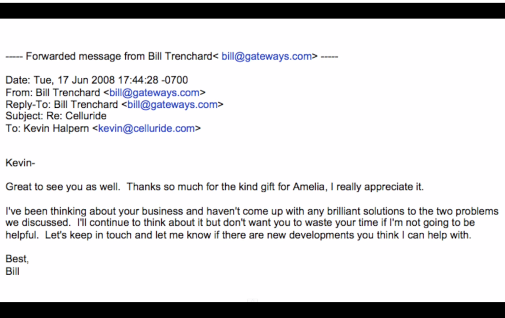 And indeed, copies of email exchanges included in the suit and shown in the video statement do indicate that Trenchard and Halpern in fact spoke about Celluride and had an ongoing correspondence.