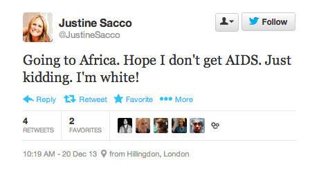 Sacco was a public relations executive at IAC until December 2013, when, en route to a family vacation in South Africa, she tweeted, "Hope I don't get AIDS. Just kidding! I'm white." One of Sacco's followers tipped off Valleywag, which published the tweet along with the headline: "And Now, a Funny Holiday Joke from IAC's PR Boss."
