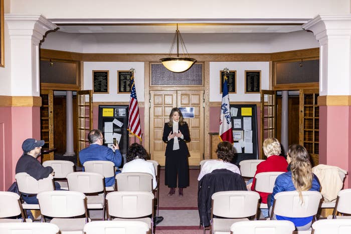 Marianne Williamson campaigns at the Union County Off-Year Caucus in Creston, Iowa, on March 2. "We need a moral and spiritual awakening in this country," she said during her campaign speech.