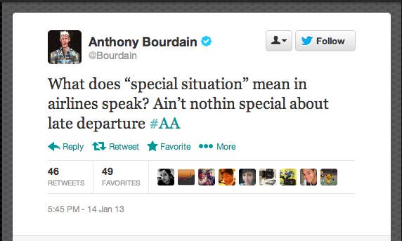 The difference between Anthony Bourdain and any other dissatisfied customer of American Airlines is that Anthony Bourdain has over 1.3 million Twitter followers. When he took to Twitter to publicly complain about the airline — giving his rant its own hashtag home — 1.3 million people were there to listen.