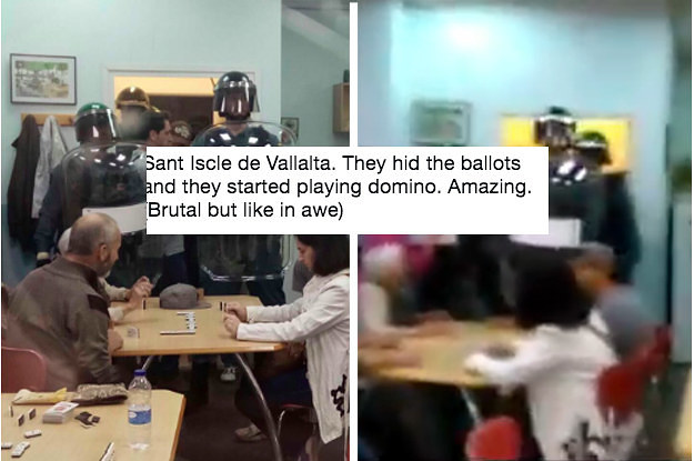 The Spanish Army looking for poll boxes, intimidating with weapons. Our response: play domino. Our poll boxes were… https://t.co/5i9uyDVXuA