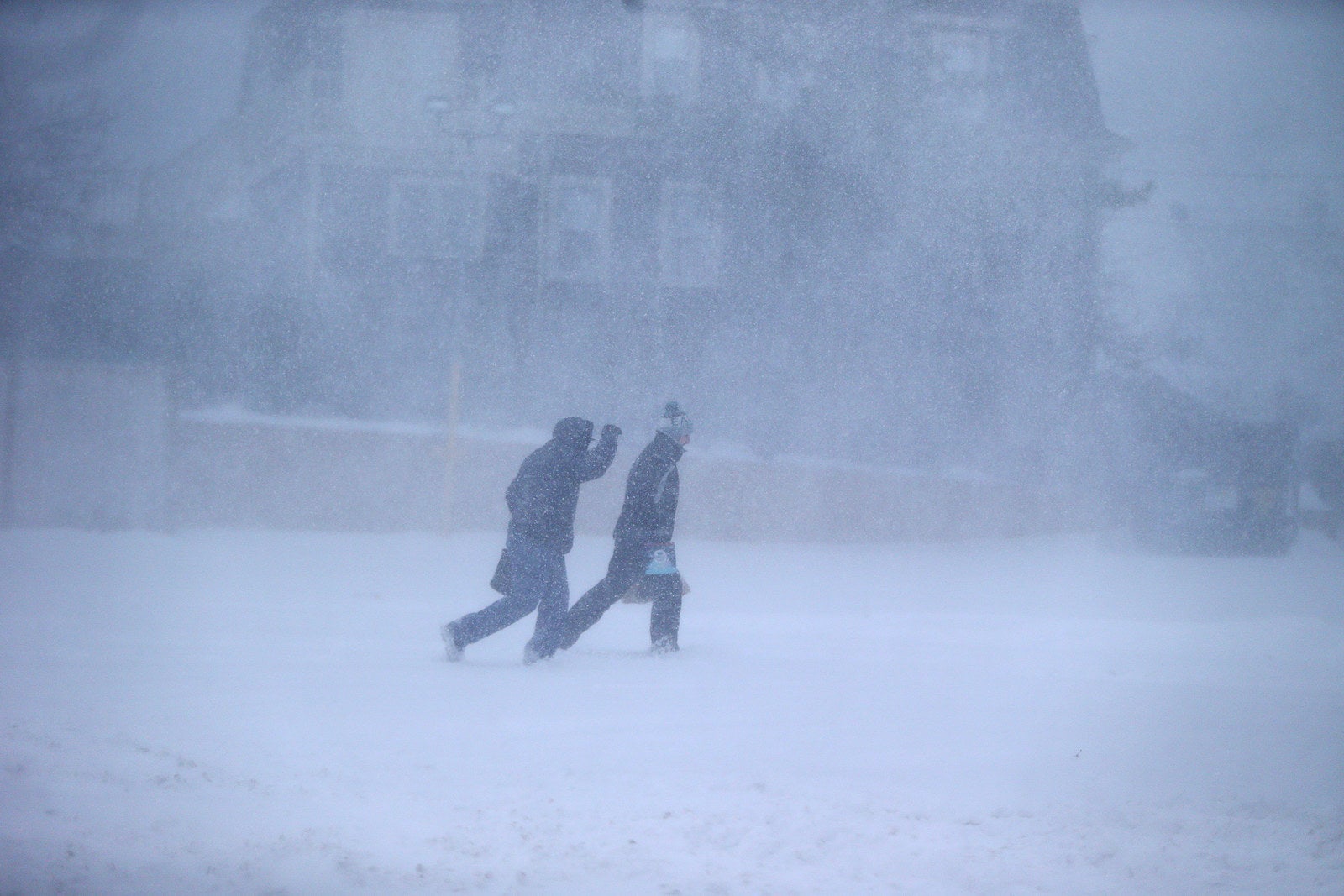 Two people brave snow and high winds during a winter storm in Hingham, Massachusetts.