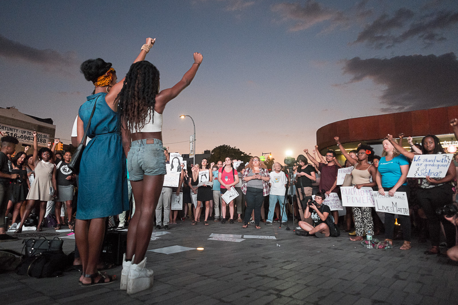 At the end of the speeches and after sunset, many people continued to linger and talk, as Biko and another black trans woman, Shagasiya Diamond, spontaneously drummed on buckets and sang the Janelle Monae protest song “Hell You Talmbout” and its title refrain, along with the repeated invocation, “Say her name!” Except instead of Sandra Bland, Freddie Gray, Michael Brown, and Eric Garner, they shouted names like Islan Nettles, Amber Monroe, and Penny Proud, all black transgender women who’ve been killed in recent years.