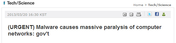 South Korea: Korea Communications Commission says they are aware of TV broadcasters and banks' computer network freeze. (@sangwonyoon)-- Michael Rusch