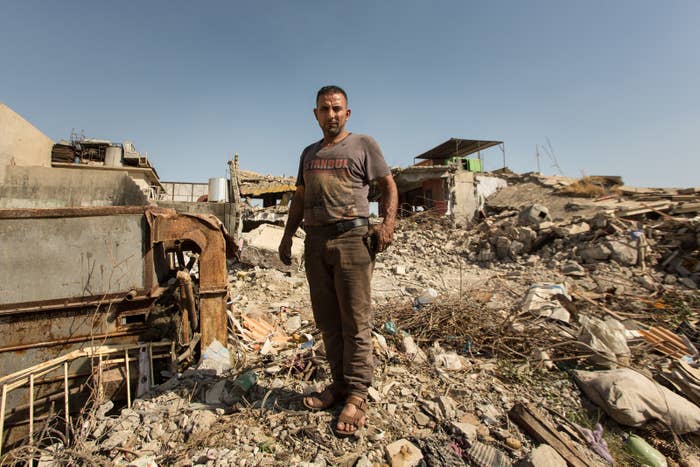 Hasan Ali Hasan at the site where his wife and daughters were killed in a coalition strike in Mosul.