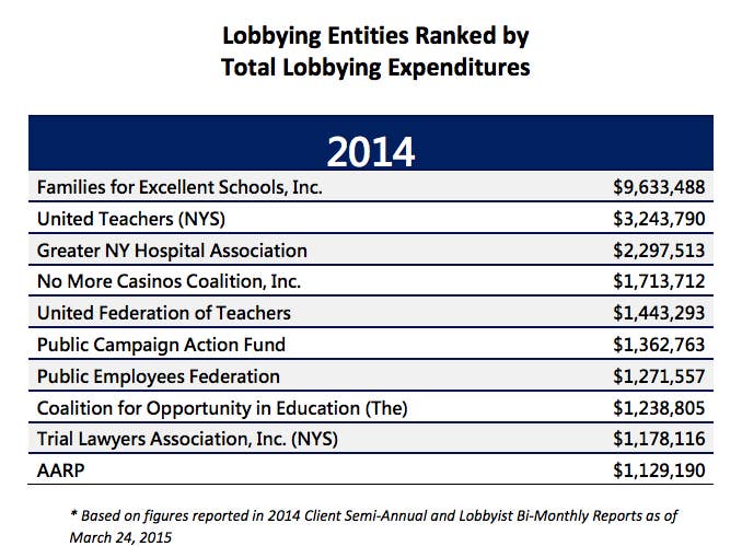 Unions, which include both the statewide group and New York City's 180,000-member United Federation of Teachers, have long been forces in state and national politics. But Families for Excellent Schools, which outspent the next four highest groups on the list combined, did not even make the top 10 highest spenders in New York in 2013.
