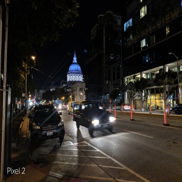The Pixel 2 actually produced a better nighttime shot here, but the phone does not have a telephoto lens for 2x optical zoom.