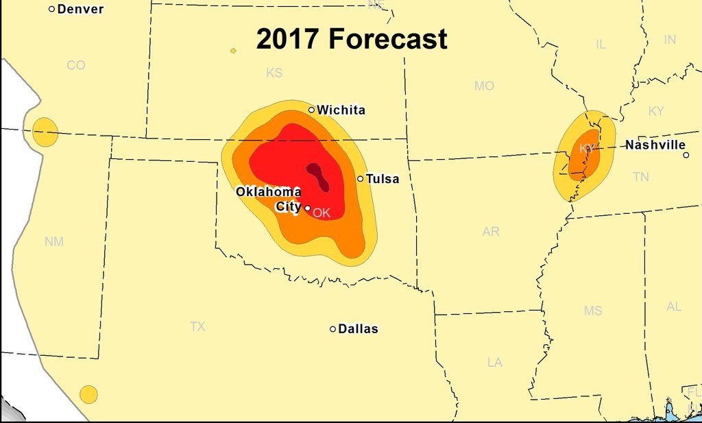 The Dallas Fort Worth area in Texas, home to a cluster of drilling sites, was flagged as another region of risk in the 2016 assessment. But that area saw almost no significant seismic activity. The hazard level for that area has been downgraded in the forecast for 2017.