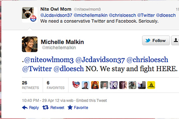 The episode led some conservatives to suggest moving camp from the ostensibly neutral ground of Facebook and Twitter to social media services that are more explicitly on their side, an idea that Malkin fiercely rejected.