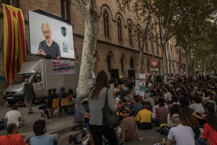 Julian Assange holding a video conference with Catalan students outside the University of Barcelona on Sept. 26, 2017.