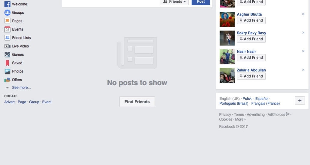 Here's my completely empty News Feed.