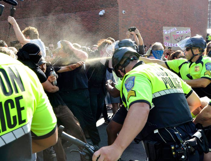 So when things began to turn nasty on the parade route, tensions were particularly high. The police line between counter-protesters and paradegoers quickly dissolved. Fights broke out. Proud Boy member Kenny Lizardo angrily chased a group of teenage protesters down the street. At one point, Yiannopoulos had to leave his float flanked by private security as counter-protesters swarmed him. Police on bikes and motorcycles had to break up the crowd; there was pepper spray and batons. In the end, about 50 paradegoers made it to City Hall Plaza’s amphitheater. And hundreds of protesters raged at them from outside.