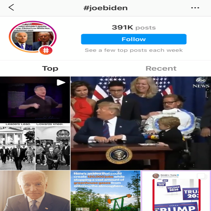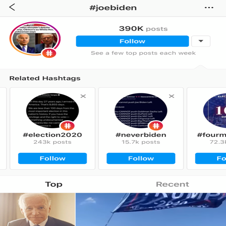 An examination by BuzzFeed News found that Instagram prevented related hashtags from populating for #Trump, which had been used on 14.6 million posts; #Trump2020, which had 2.5 million posts; and #MAGA, which had 5.6 million posts. Meanwhile, the hashtag #JoeBiden, which has been used on 390,000 posts, appeared alongside negative hashtags including #creepyjoebiden and #neverbiden, as well as seemingly pro-Biden content like #joebidenforpresident.