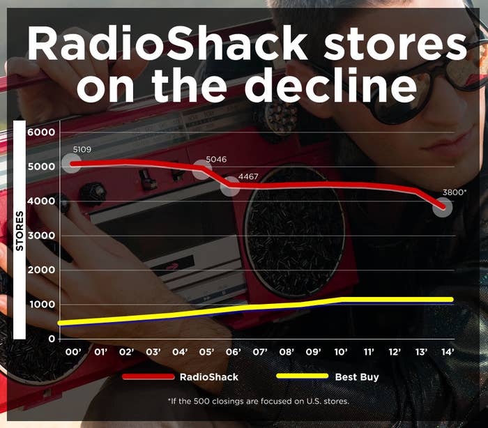 If the 500 closings are focused mostly on RadioShack's U.S. stores, it would bring the chain's domestic store count to somewhere in the 3,800-range, from more than 5,000 a decade ago. BuzzFeed put together a chart showing the decline of RadioShack's U.S. company-operated stores since 2000, along with the nation's number of Best Buys in the similar period, to put the chain's size into context.