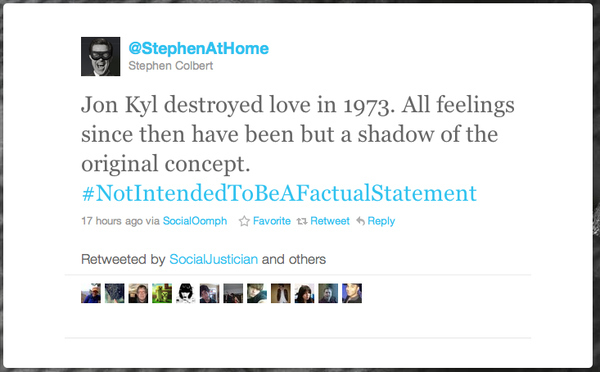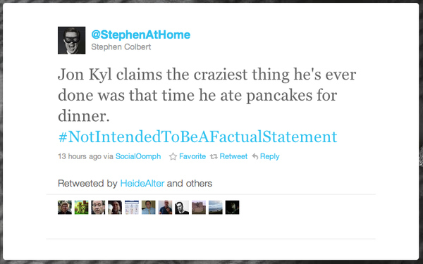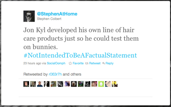 Oh, what a glorious series. Jon Kyl isn't interested in facts, and neither is Stephen Colbert, which is what makes this stream of Tweets such perfect Photoshop fodder. #NotIntendedToBeAFactualStatement