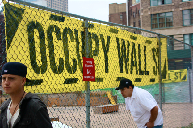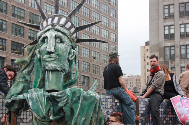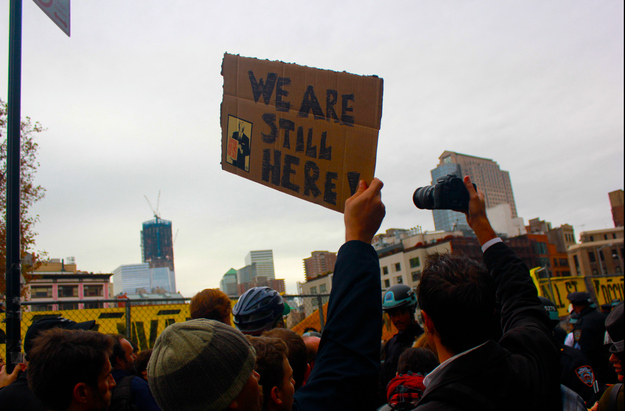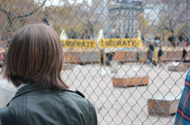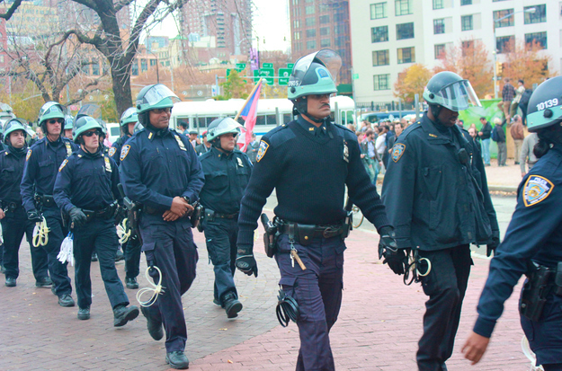After this morning's clean sweep of Zuccotti Park, protesters and police headed up to Duarte Square. Around noon, the police massed and arrested about two dozen protesters who'd gathered inside the fenced-off private land on the west side of the square.