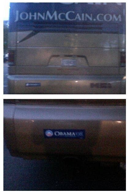Some jokester in Florida managed to get an Obama bumper sticker on John McCain's bus.
