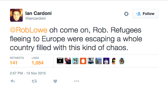 But then posted about France's borders, which a lot of people took to mean that Lowe is against Middle Eastern refugees seeking solace in Europe.