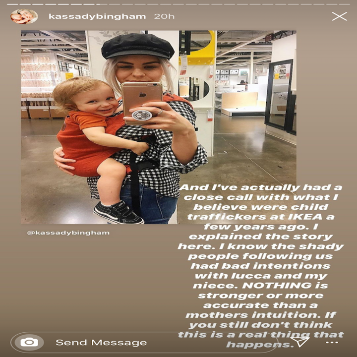 Fashion blogger Suzy Shattuck (153,000 followers) made an entire highlight explaining the theory, and mom influencer Kassady Bingham (168,000 followers) even claimed while discussing the Wayfair conspiracy that her own child was almost trafficked.
