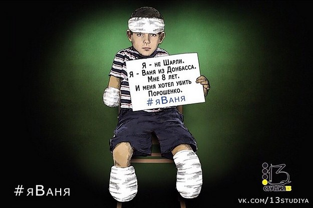 "I am not Charlie," the sign the boy in this picture reads, "I'm Vanya from Donbass. I'm eight years old. And Poroshenko wanted to kill me. #I'mVanya"
