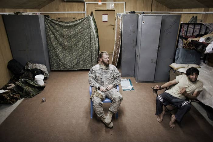 A US civilian anthropologist talks to an Afghan interpreter in the interpreters barracks on Aug. 8, 2009, in Camp Clark, Nader Shah Kot, Khost Province, Afghanistan.