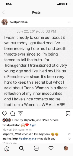 When asked if she had lied about coming out, Pinkston said, "The only reason I had lied was because of the death threats. And I was scared, so I thought they would accept me only if I said I was trans."