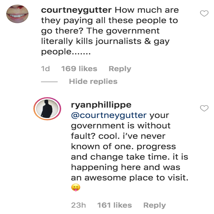 Phillippe argued in the Instagram comments that all countries have "issues" and "faults." He said he believes that Saudi Arabia is "changing and progressing rapidly."