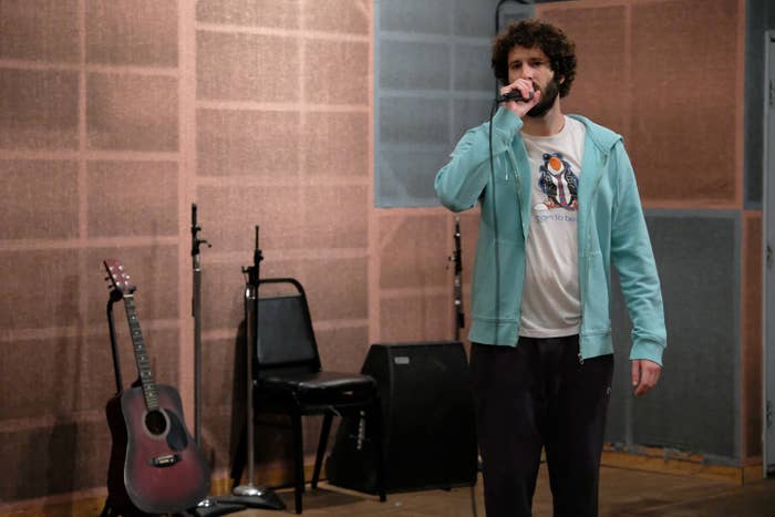 Lil Dicky (government name: Dave Burd) is a 32-year-old white rapper from the suburbs of Philadelphia. His music, starting with his first viral hit, “Ex-Boyfriend,” in 2013, has hinged on his ability to relate to awkward white middle-class hip-hop fans everywhere. Lil Dicky’s persona, evident by his self-deprecating rap moniker, is that of the nerdy white guy, determinedly out of his element among more credible black MCs. My personal introduction to Lil Dicky’s oeuvre came courtesy of his appearance in this questionable 2016 music video for the Trinidad James single “Just a Lil’ Thick (She Juicy).” In the video, which is supposed to be a lighthearted paean to women in the “175 and up club” — though, like most endeavors of this ilk, it’s mostly just condescending and objectifying — Lil Dicky is the white guy awkwardly bopping around in the background as James and Mystikal rap about the virtues of a full-figured woman. At one point, Lil Dicky sits in a hot tub as two black women feed him chicken; in another scene, he raps between two black women’s ample butt cheeks.