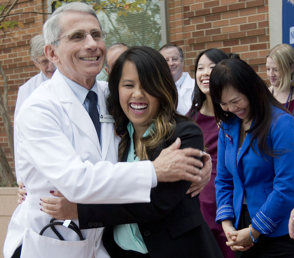 Patient Nina Pham is hugged by Dr. Anthony Fauci, director of the National Institute of Allergy and Infectious Diseases.