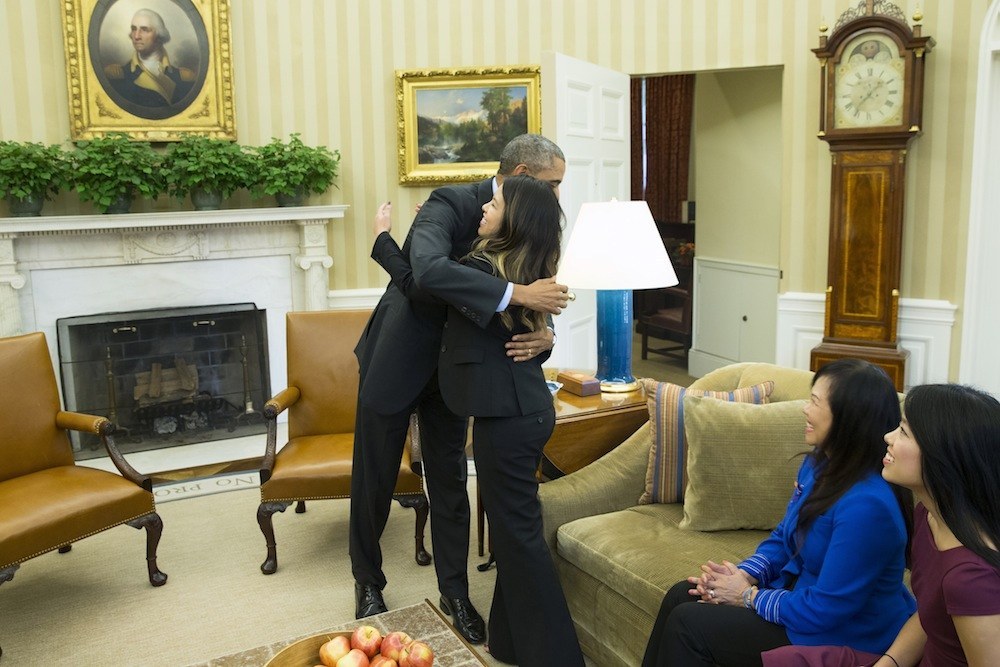Nina Pham gets a hug from President Obama in the Oval Office on Friday afternoon, just hours after being declared Ebola-free.