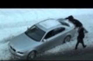 Three people struggle to push a car out of the snow after a snowstorm came through the area.