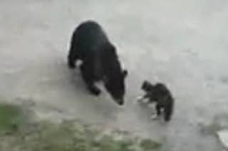 A cat scares off a wild bear. But the bear did manage to get away with the family trash.