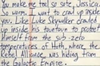 "You make me feel so safe, Jessica. So warm. I want to crawl up inside you. Like Luke Skywalker crawled up inside his tauntaun to protect himself from the sub-zero temperatures of Hoth, where the Rebel Alliance was hiding from the Galactic Empire." *sniff* *sniff* How could any nerd girl not be smitten by that (after correction about Han doing the Tauntaun shoving first, of course) !
