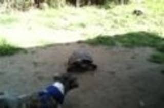 A doggie gets bullied by a tortoise but is quickly (ok not so much) saved by the hero tortoise in the background Watch it all go down about 1 minute in. It gets pretty intense.