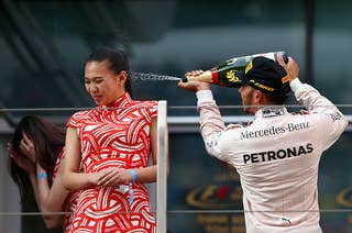Photos of the hostess as she was sprayed with champagne by Hamilton after his victory in the Chinese Grand Prix have been met with criticism.