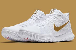 The Nike Kyrie 3 releases in white and gold for $120 on July 20, 2017.