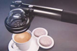 A portable manual espresso machine that works like a bicycle pump and creates a perfect cup of espresso anywhere, as long as there's hot water.