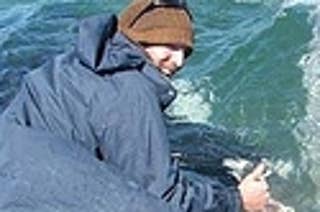 This is Leon Deschamps, sitting on a dead whale, while a bunch of sharks eat it!!! He even pats a shark on the head. Yeah, he's badass, what did you do today? Loser!!