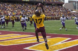 A University of Minnesota football player showed off some ridiculously athletic skills catching two balls (video).