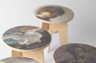 Piet Hien Eek prints famous artworks from Amsterdam's Rijksmuseum onto flatpack plywood stools in his new project.