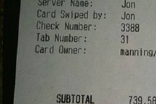 A photo showing NFL star Peyton Manning’s hefty $739.58 bill from The Angus Barn in North Carolina cost the server/mobile phone photographer his job. After the photo made its rounds on the web, the restaurant owner fired the server who posted the picture and said she would call Manning to apologize.