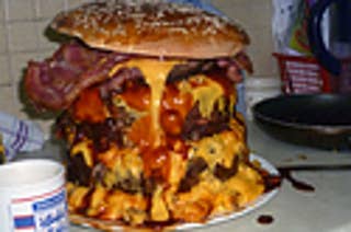 Burger, burger, bacon, cheese, Jack Daniels, BBQ sauce, and more bacon. 35,000 calories has never stacked up so ridiculously.