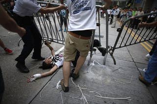 Hundreds of angry people attempted to charge the barricades erected by demonstrators calling for a free vote in Hong Kong's 2017 chief executive elections.
