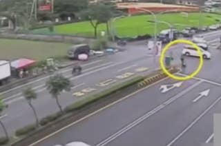 A scooter rider in Taiwan was hit by a car, flipped in the air a few times, and landed in an inflatable pool nearby.
