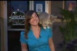 On Thursday, Fox 17 reporter Nicole DiDonato was delivering her live report on ways to beat the summer heat when a stray cat suddenly climbed up onto her shoulder
