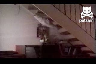 Kitten Takes A Cardboard Box Escalator Down A Staircase